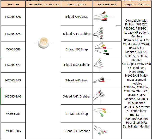 "Compatível com Philips. 78352C, 78354C, 78834C patient Monitores de pacientes HP legados 862472 a 862475 Monitor C3, 862478, 862479 Monitor C3, 863064, 863065, 863066, 863068 SureSigns VM6, VM8 Módulos de ECG, M1001A / B, M1002A / B Multi- módulos de medição M3000A, M3001A, M3002A MMS X2, M8102A Monitor MP2, M8105A Monitor MP5 M4735A Monitor desfibrilador heartStart XL, monitor desfibrilador HeartStart XL M3535A / M3536A "